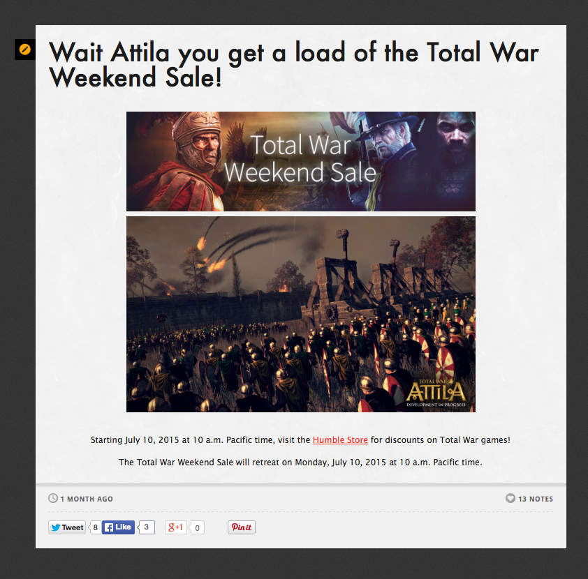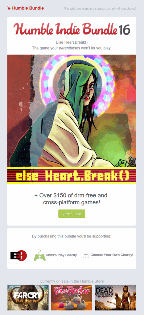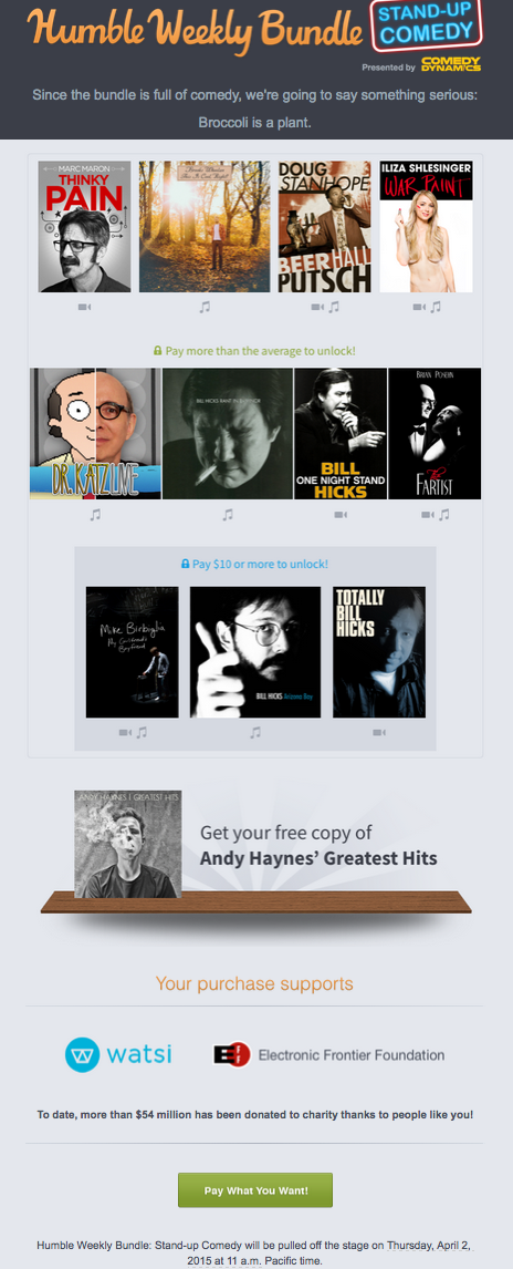 Each email was a relatively simple visual layout of the bundle’s lineup. I was primarily responsible for the subject line and, on some, little pieces of jokey “flavor text” that sat under the bundle title and that described the duration at the very bottom of the email. Each subject line we A/B tested, and the longer I was there, the better idea I got of what worked and didn’t work.