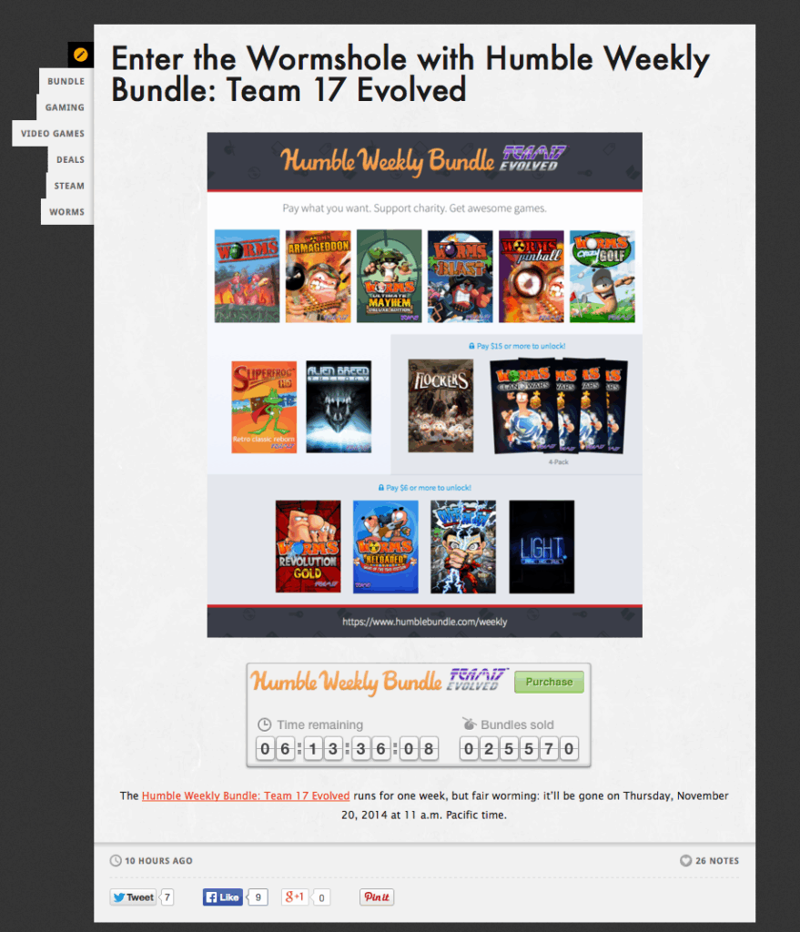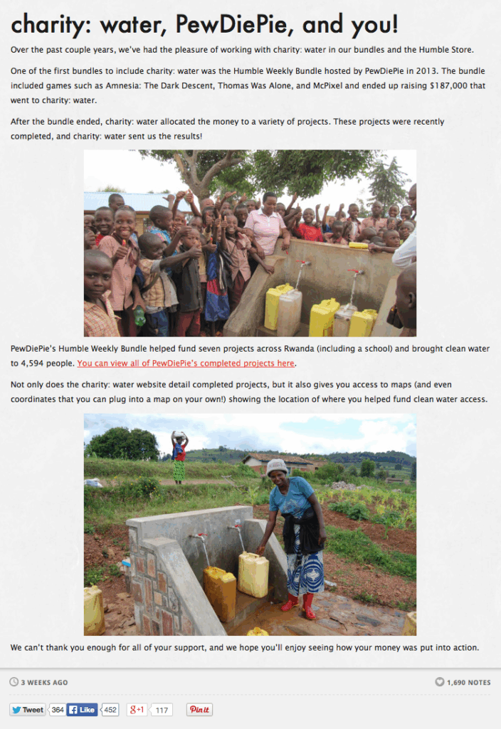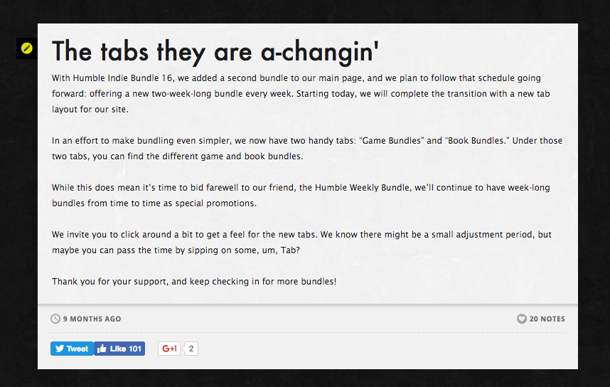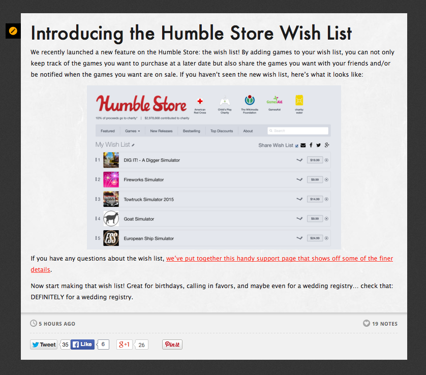 We took a similar approach to the blog, but what we also included in the blog were posts about site updates and charities we worked with, so the blog was our primary source for long-form company announcements. We hosted it on Tumblr, so we had followers in that community, and it was accessible to everyone from our site header.