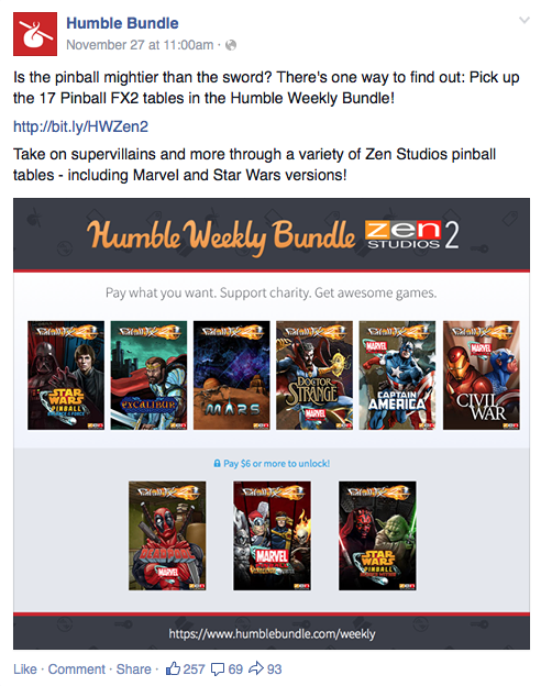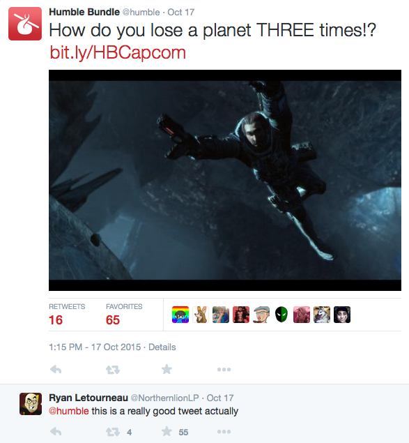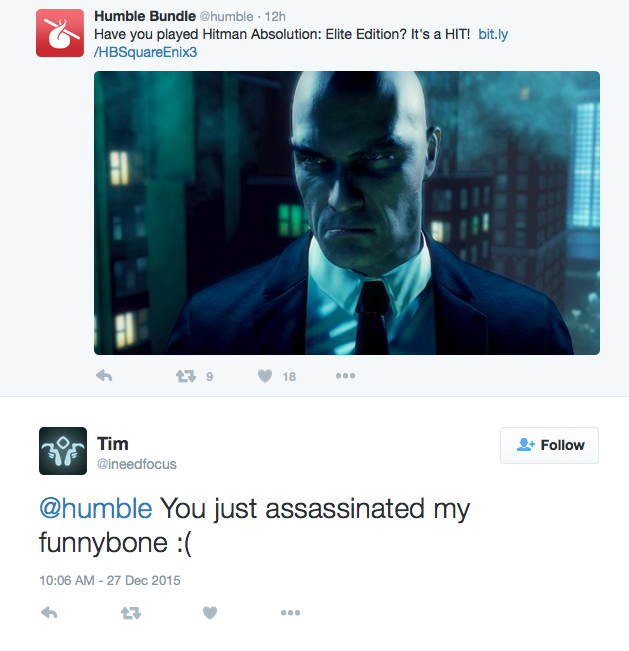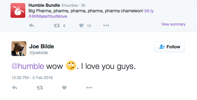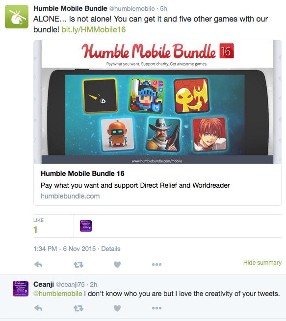Twitter gave us the most ability to have fun because we didn’t have to deal with an algorithm in the same way as Facebook, so our strategy was to largely only announce the release of bundles and sales on Facebook and then take to Twitter for more frequent goofy posts about the individual games in the bundles.